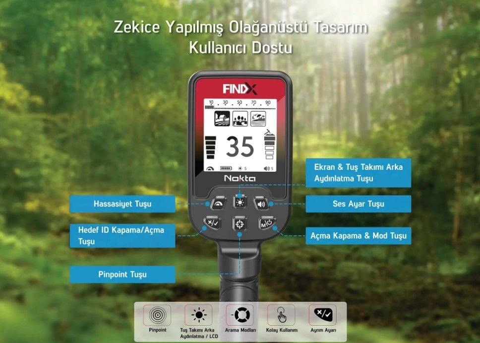 FINDX metal dedektörünü keşfedin! Tam otomatik arama modları sayesinde, Arazi, Park ve Plaj gibi farklı zeminler ve hedefler arasında sorunsuz bir şekilde geçiş yapabilirsiniz. Aç ve kullan tasarımı ve basit tek menü arayüzü ile FINDX, çeşitli zeminlere uyum sağlamayı başlangıç seviyesindekiler için bile kolaylaştırır! Hedef ID Ölçeği ve Hassasiyet ayarları, yeni başlayanlardan profesyonellere, çocuklardan yetişkinlere kadar herkes için kolaylaştırılmıştır.